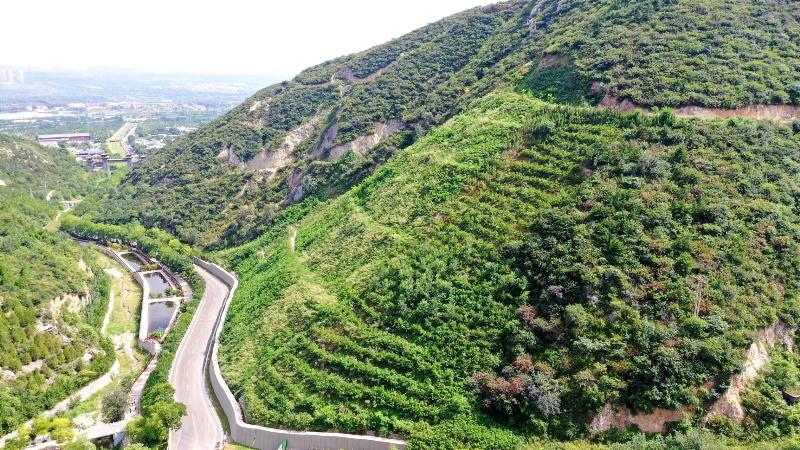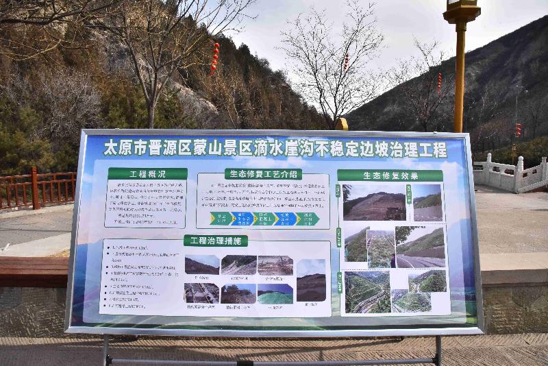 (圖片為生態(tài)修復(fù)治理五年后晉源區(qū)蒙山景區(qū)滴水崖溝不穩(wěn)定邊坡)