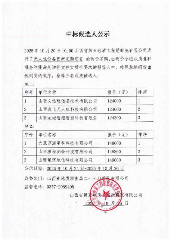 山西省第五地質(zhì)工程勘察院有限公司無人機(jī)設(shè)備更新采購(gòu)項(xiàng)目中標(biāo)候選人公示